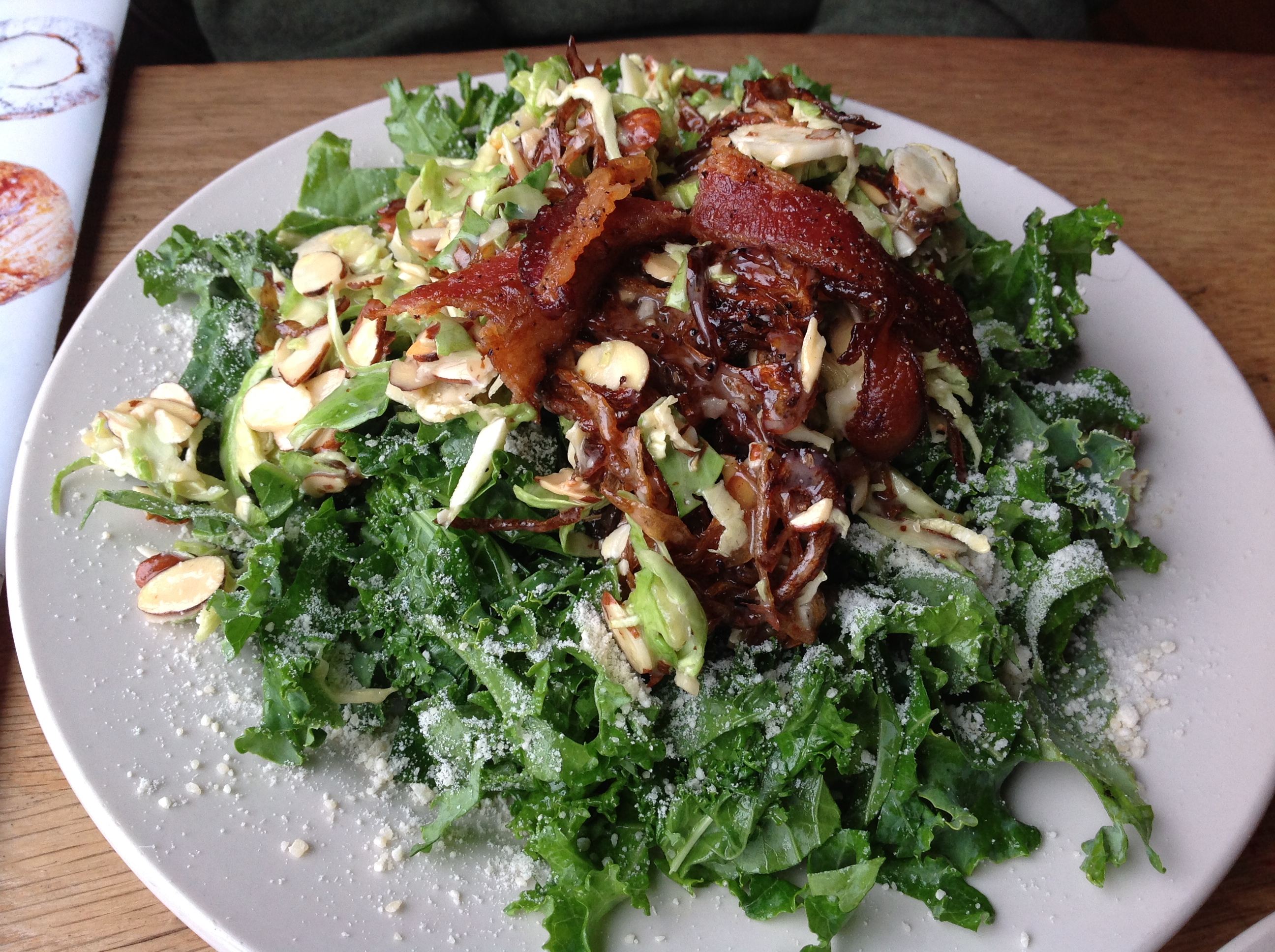 But the part of the lunch I can’t stop thinking about was the outstanding kale salad! This one blew us away…kale with shaved Brussels sprouts, slivered almonds, grated parmesan, fried shallots, brown sugar bacon and maple tahini vinaigrette…holy cow! So simple, yet so delicious!
