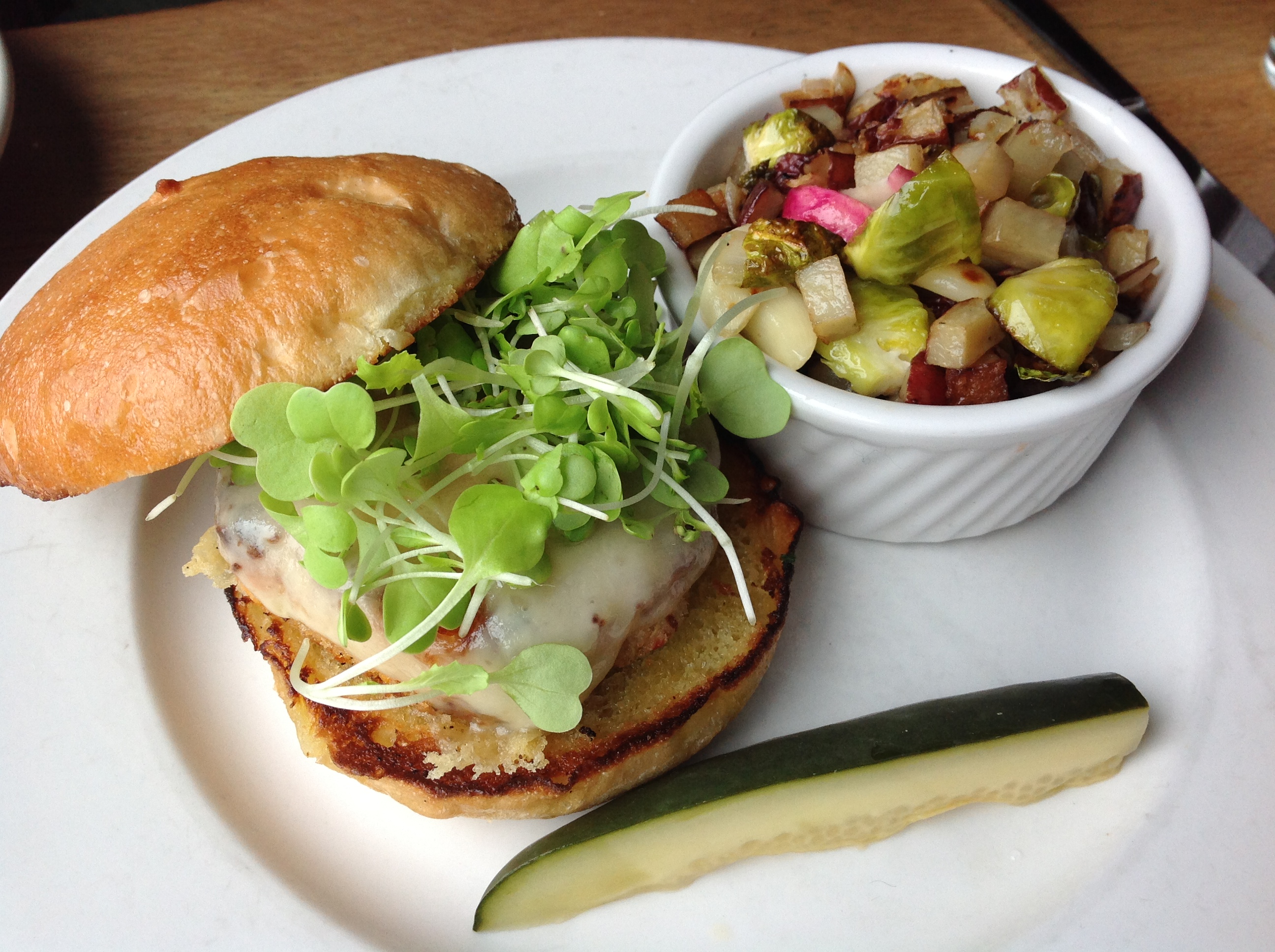 For lunch, we enjoyed a Sweet Potato Quinoa Burger made with cannellini beans, sweet potato, red peppers, jalapeño, quinoa, Emmentaler cheese, dwarf sugar pea shoots and maple tahini vinaigrette dressing, served on a local Farm-to-Market toasted bun — it was out of this world!