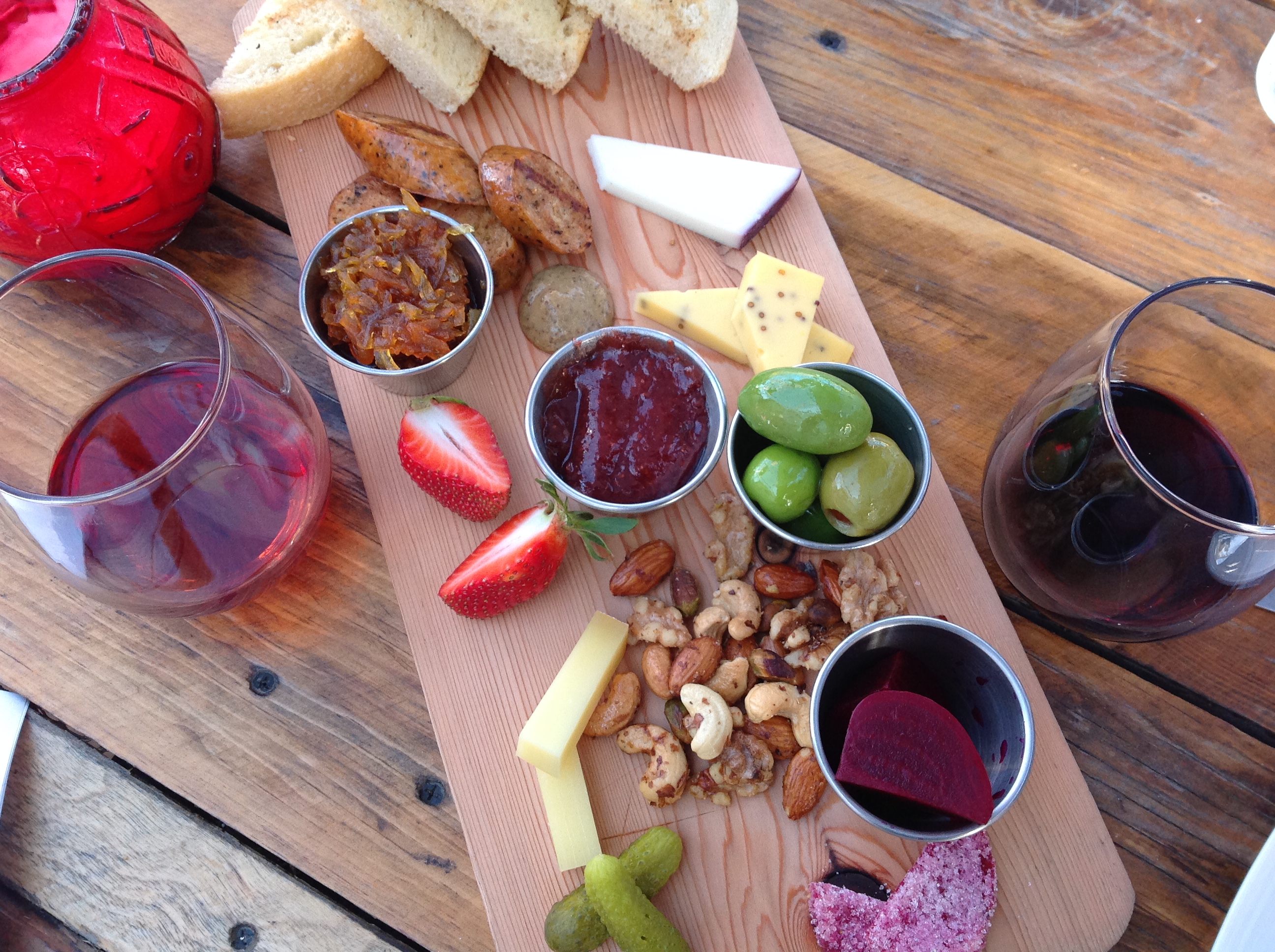 Eat REAL America comment: our meal was incredible! We started with an appetizer that included cheese, pickled beets, strawberries, sausage, mustard, jam, grilled bread and more.