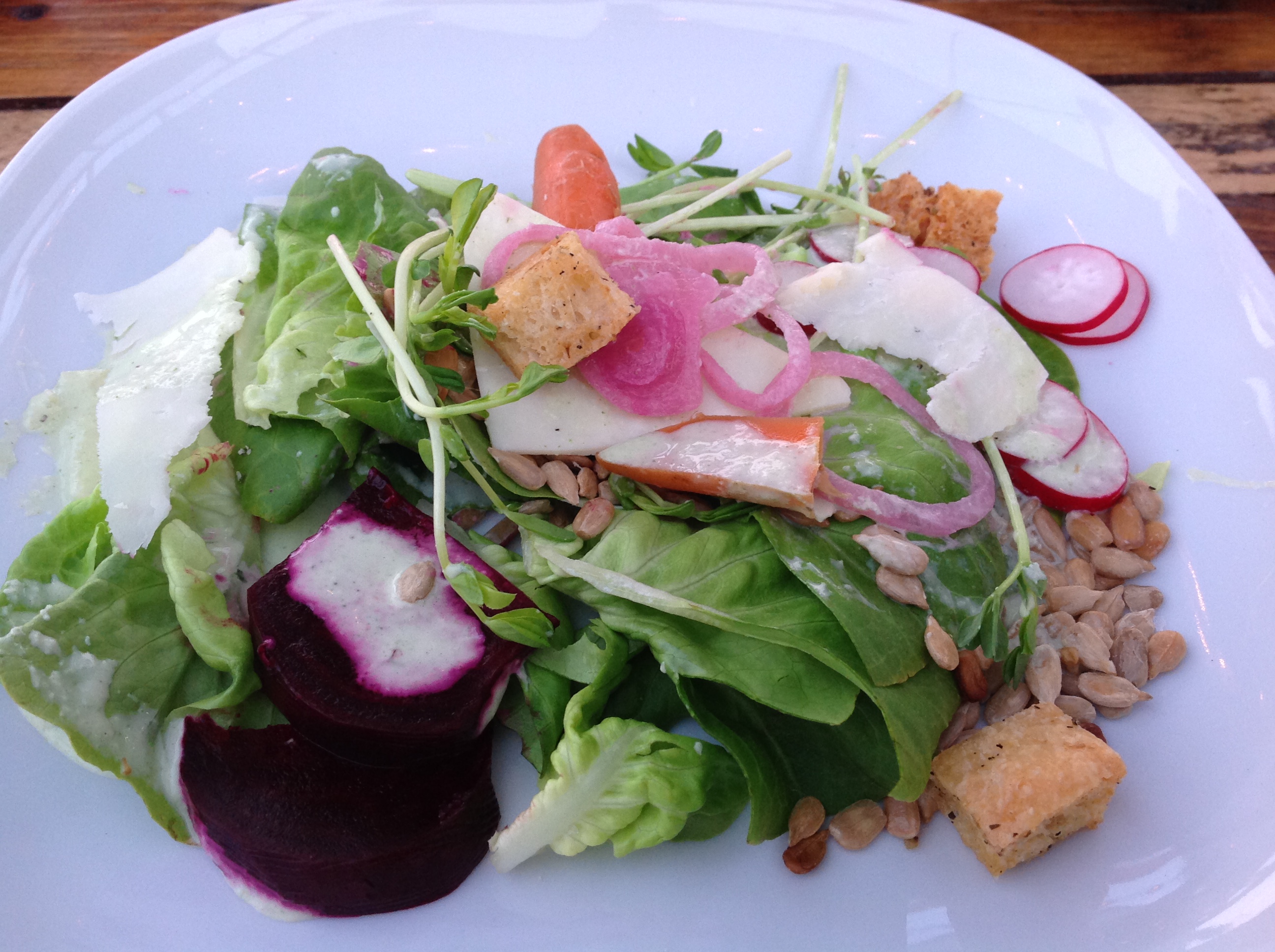 After our first-ever Uber ride, we sat down at a beautiful rustic wood table on the cozy and quaint covered patio (only outdoor seating here!). We were delighted that Coral (who, with her husband, Russ, opened the restaurant a little over a year ago) agreed to sit down with us to share more about Garden Kitchen…