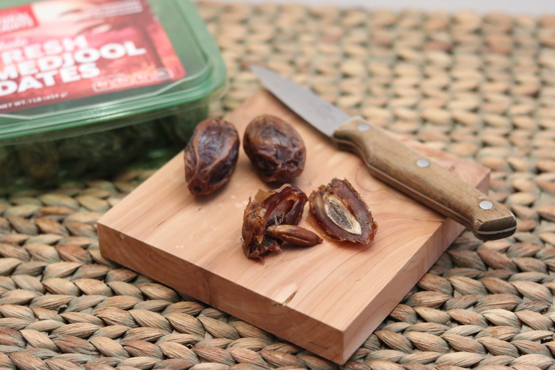 If the pits haven’t been removed, it is super-simple…you can either use your fingers to pull the date apart and the pit will easily come out, or you can use a paring knife to cut the date lengthwise to remove the pit.