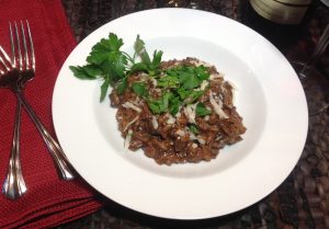 To rehydrate dried mushrooms, place them in a bowl and add hot (or boiling) water, just enough to cover them, and let them sit in the water for 10-15 minutes. Keep in mind, you can save the soaking water and use in a recipe such as the Creamy Mushroom Risotto — it adds great flavor!