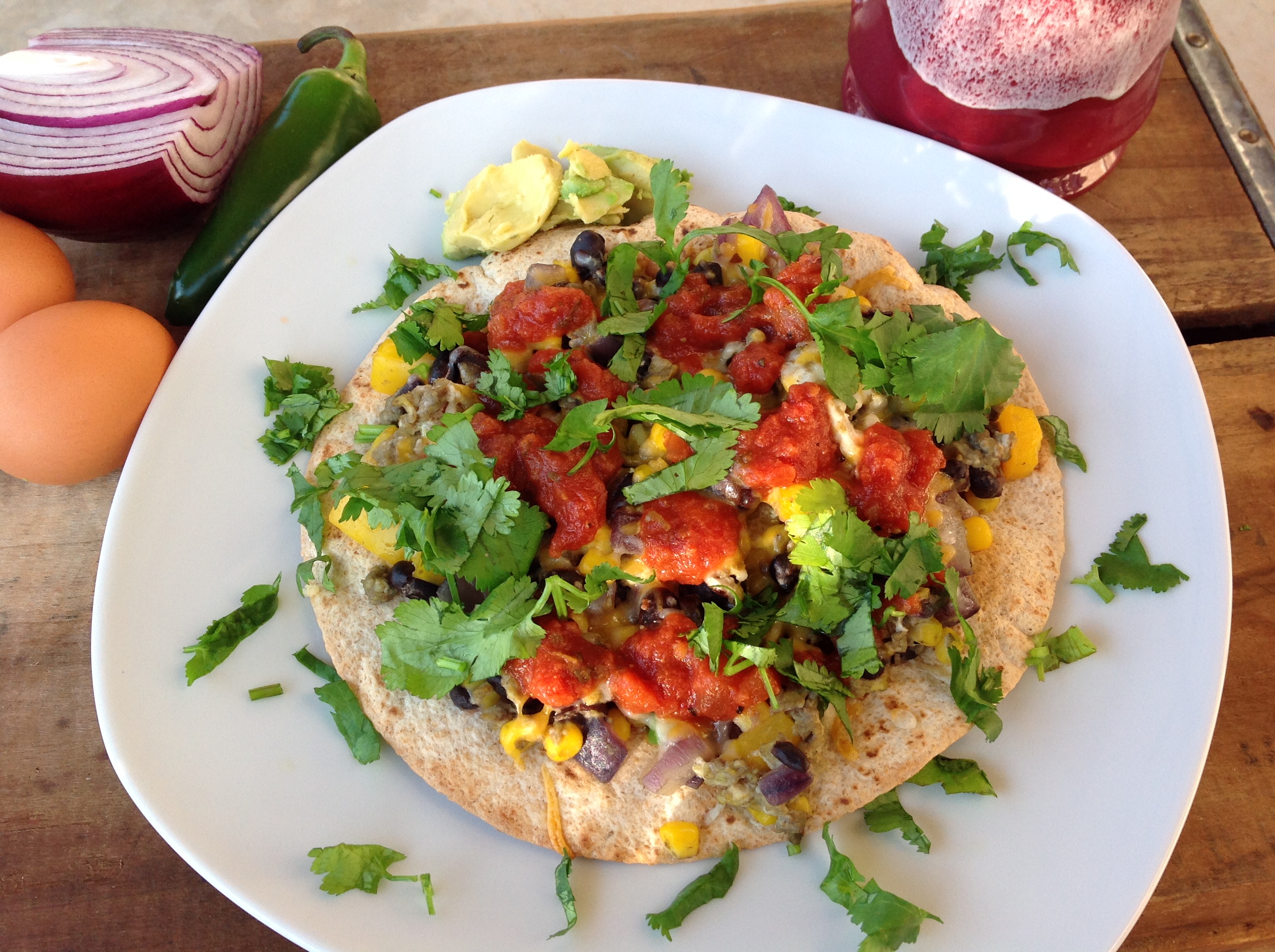 Mexican Breakfast Pizza- Black Bean Burger with Egg and Sriracha Spread