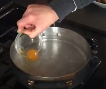 - While the water is coming to a simmer, crack the eggs individually into small bowls or ramekins (or measuring cups will also work). If you are really quick at cracking eggs (without breaking the yolk), you can also try your luck with cracking them directly into the water.