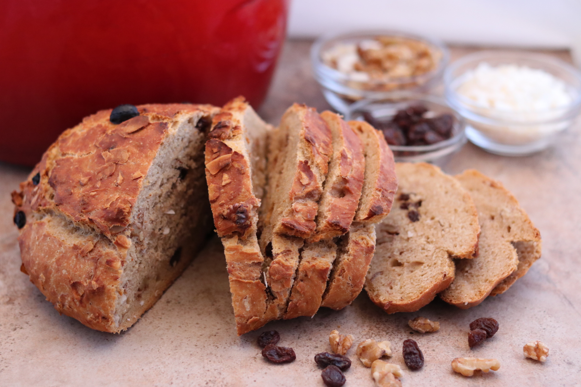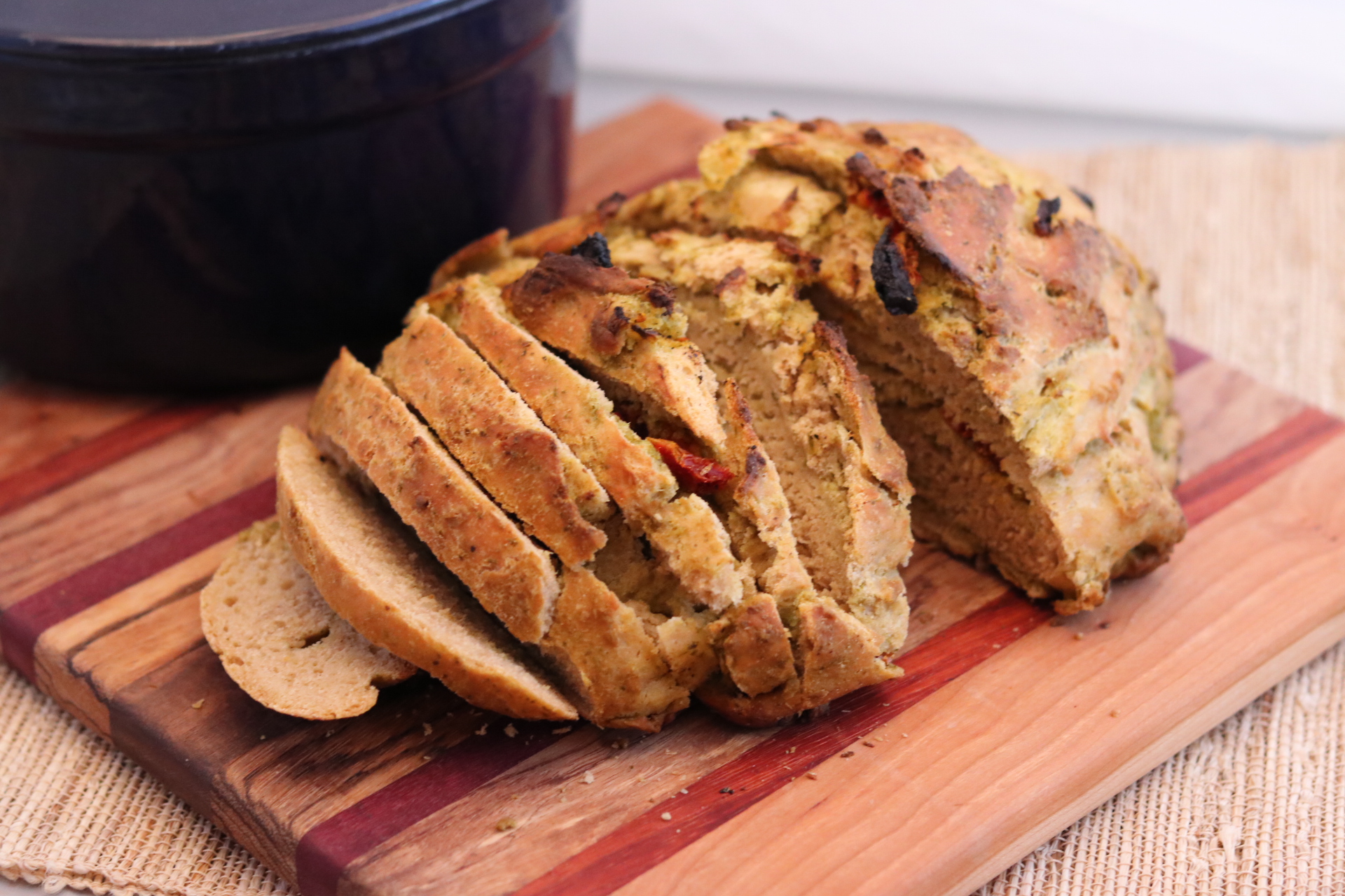 Cranberry Walnut – add 1/3 cup of chopped walnuts and 1/3 cup of dried cranberries to the dough before baking.- Pesto and Sun-Dried Tomato – add 1/4 cup of pesto and 1/3 cup of sun-dried tomatoes to the dough before baking. (Tucking the sun-dried tomatoes into the dough before baking will keep them from browning too much.)