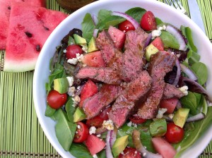 “We enjoy grilled steak salads in the summer and this one was just delicious! What makes it special is the unique combination of flavors and textures including watermelon, blue cheese, and avocado. We loved the addition of finely chopped shallot in the dressing — you get high marks for being so inventive!”
