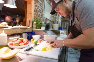 Use those caramelized onions! Last week, we provided a coaching tip on the flavor-loaded caramelized onions, including how to prepare them in the slow cooker. They are perfect as toppings on the Caramelized Onion & Sausage Pizza, the Caramelized Onion, Fig & Gorgonzola Pizza (if you have never had figs on a pizza, you gotta try this!) and the Moroccan Spice Lamb Pizza. The lamb pizza was inspired by a talented local chef (Chef Travis is pictured left), who prepared this for our first-ever Eat REAL America farm-to-table lunch celebration several years ago!