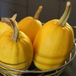 Delicata squash: also known as the “sweet potato squash,” this squash is shaped like a small cylinder and typically has yellow skin with green stripes.