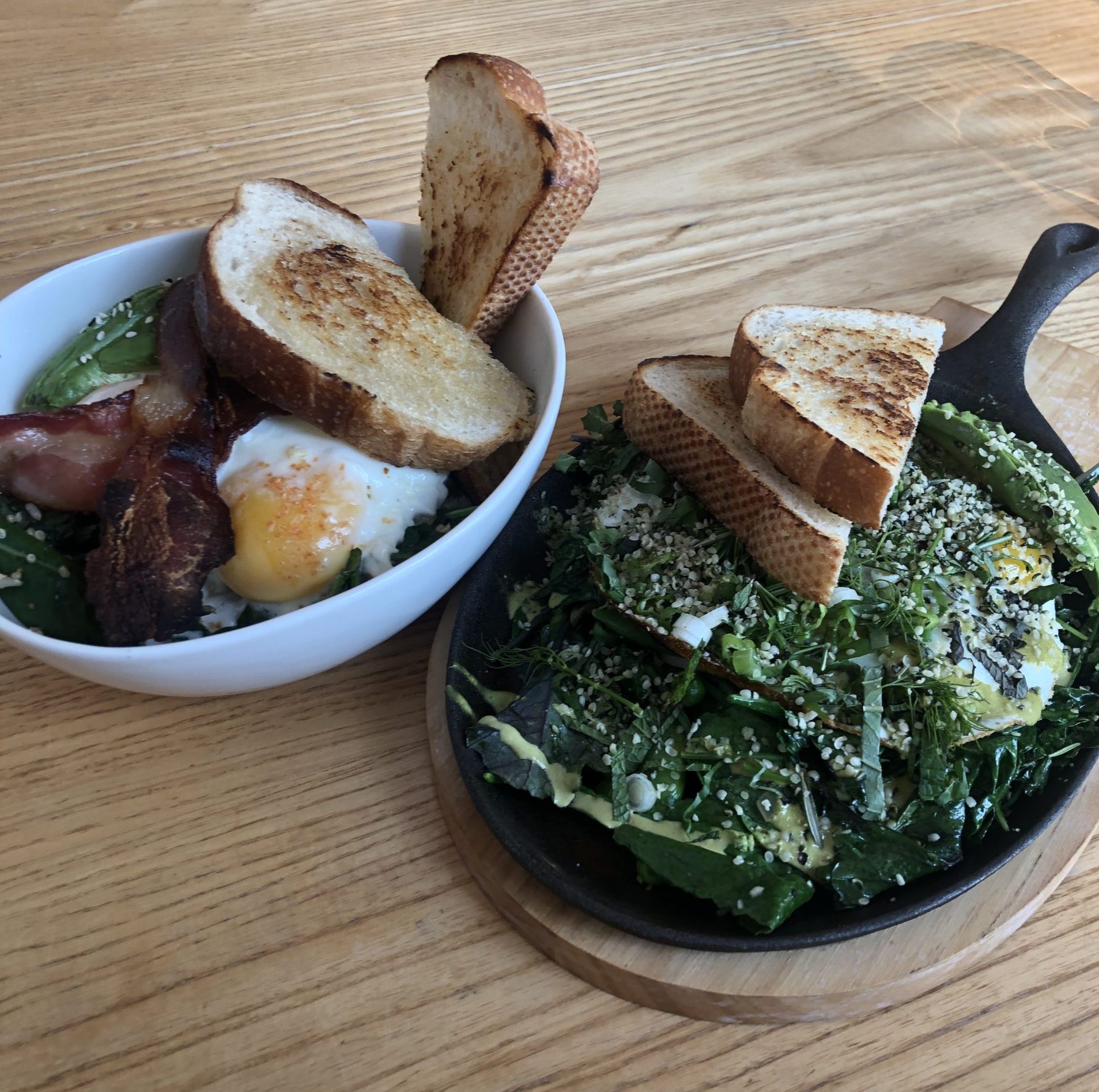 Billie’s Bowl included two “creamed eggs,” roasted potato, mushrooms, bacon, onion, organic kale, brown rice, quinoa, avocado, sriracha sea salt, and then served with a slice of sourdough toast. As we were enjoying these dishes, we looked at each other and said, “there is no way we would have gotten a breakfast like this at the other places we were considering.”