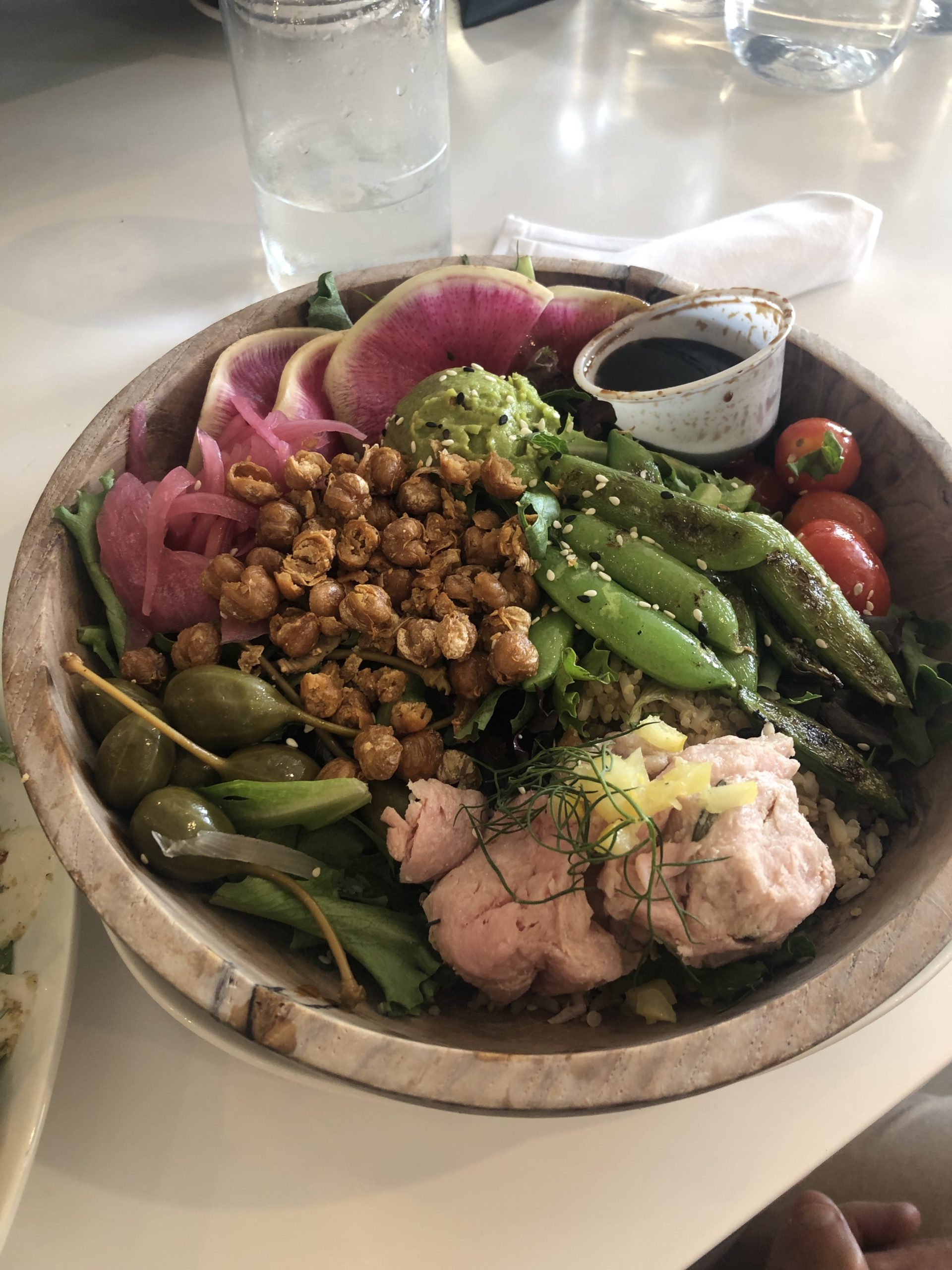 The tuna bowl included wild caught tuna, fresh organic greens, caper berries, roasted tomato, sautéed sugar snap peas, pickled red onions, sliced radishes, avocado, crispy chickpeas, preserved lemon, fresh herbs and a spicy balsamic dressing. Both were absolutely delicious!
