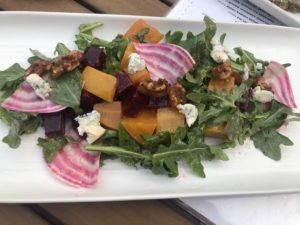 The atmosphere was very comfortable, with beautiful rustic furnishings and tables to accommodate parties of all sizes. As usual, we split a couple meals – the Green Pear Salad and the Russell Bowl.