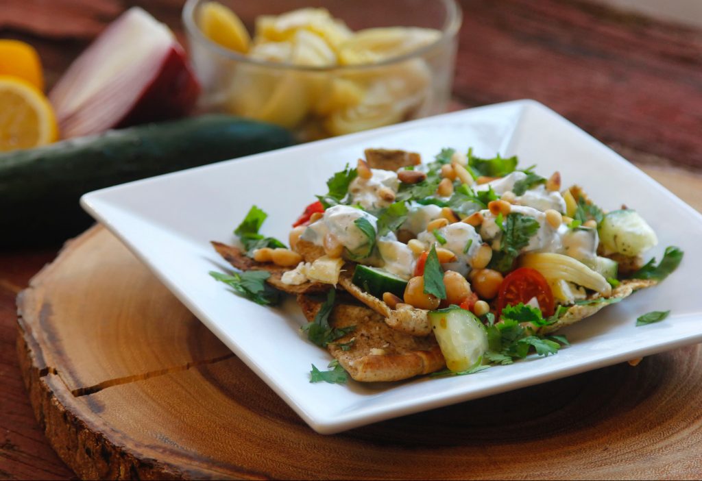Middle Eastern Nachos (the refreshing Tzatziki sauce completes this meal, which always gets rave reviews!)…a few other ideas to enjoy Tzatziki sauce include Feta Stuffed Lamb Burgers, Greek Style Quinoa Bowls and Mediterranean Meatball Gyros!