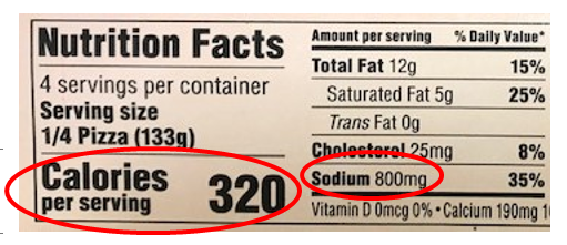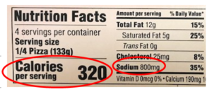 A useful rule of thumb is to look for foods where the sodium content is comparable to (or less than) the number of calories. If the sodium content is significantly higher than the calories, this is a red flag! For example, a Pizza Hut pepperoni personal pan pizza has 1,260 mg of sodium (you read right, almost 100% of the ideal daily amount). It has 610 calories, so the sodium content is more than 2x the calories – this should sound warning signals.
