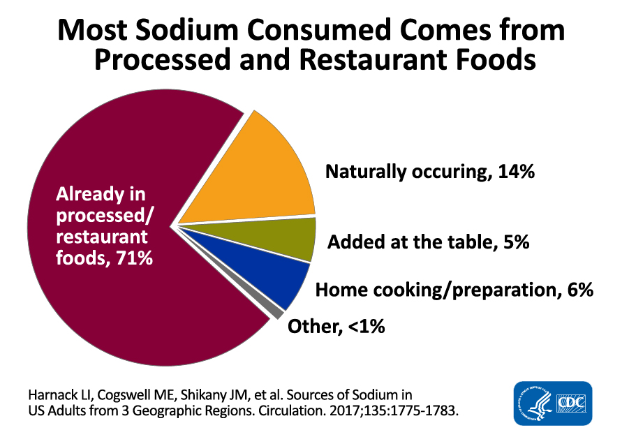According to the CDC, over 70% of the sodium consumed is from processed and restaurant foods. And, more than 40% of the sodium consumed by Americans each day comes from these top 10 food categories: