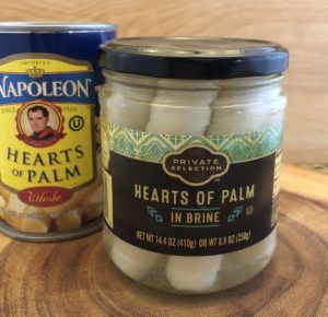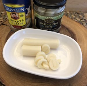 They are a vegetable harvested from the center stalk and from the buds of certain varieties of palm trees. They are sometimes referred to as “palmitos,” especially in South and Central America. Once hearts of palm are harvested (which can be a labor-intensive process), they are cut into sections that are a few inches long. The width can range in size, typically from the size of a dime to a quarter. Fresh hearts of palm are difficult to find because they are very perishable (and also very expensive). However, most grocery stores now carry canned or jarred hearts of palm preserved in water or a brine to extend the shelf life. If you can’t find them in your local store, you can definitely find them online.