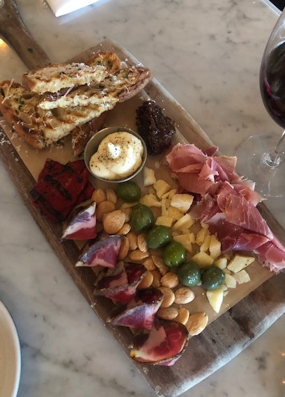 On our trips, we try to scope out good restaurant options in different parts of town. We needed an early dinner before going to a show at the renowned Bluebird Cafe. We decided on this Italian restaurant, which is located in the Green Hills Mall. Usually, a restaurant in a mall is a red flag for us, but this restaurant had good reviews and some good happy hour specials, so we gave it a try. While it is a large restaurant, it was comfortable and the service was great. Our waiter had just moved to Nashville to pursue his music career – he was still learning the ropes at the restaurant but did a great job. We enjoyed some happy hour specials including a “Classico Chef’s Board” (including a variety of meats, peppers, olives, marcona almonds, spreads and grilled bread), a Seasonal Vegetable Salad and a Bruschetta (with roasted tomatoes, cheese and basil).