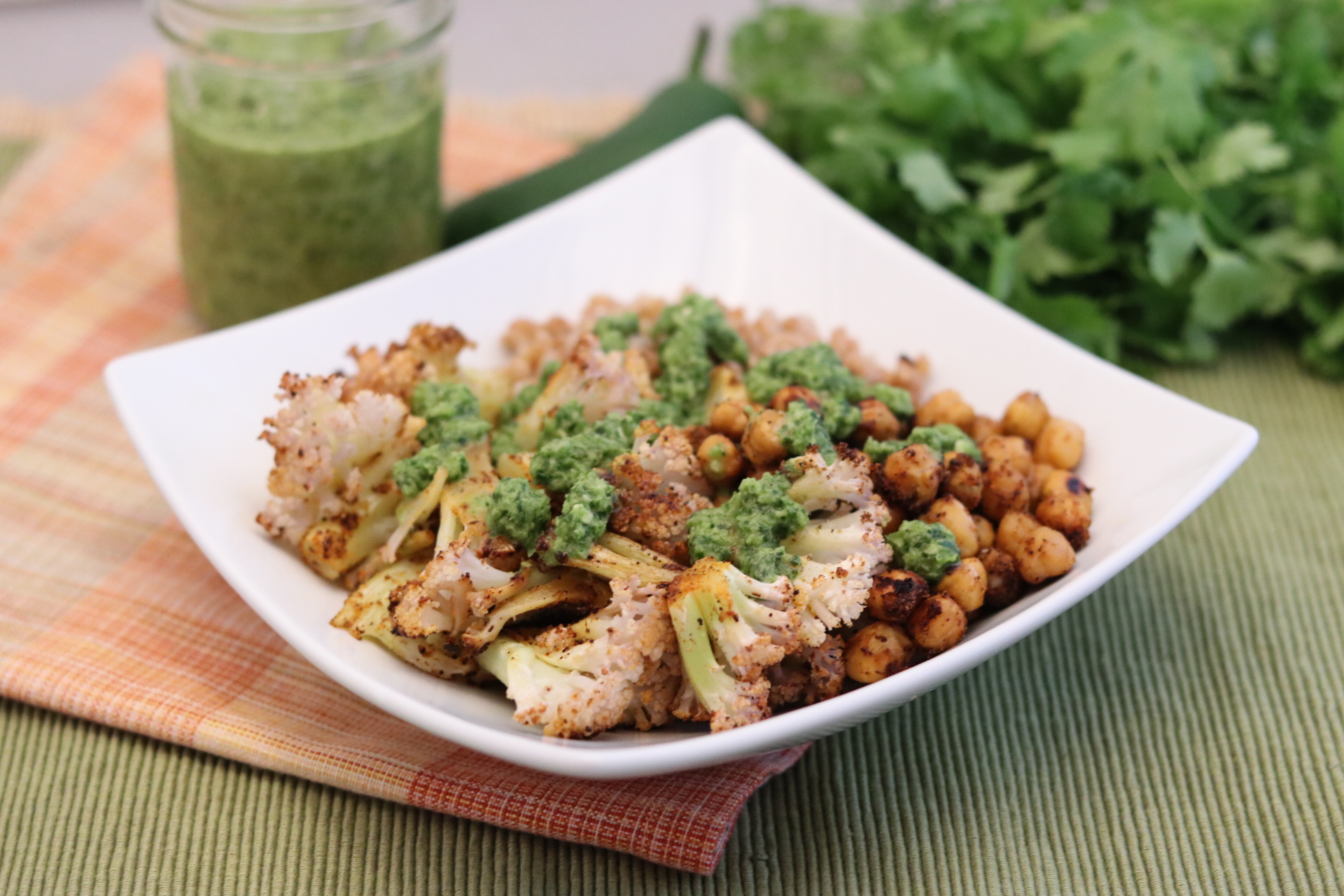 Eat REAL America favorite: Chermoula-Inspired Spice Roasted Vegetables and Chickpeas and Roasted Cauliflower & Chickpeas with Zhoug Sauce!