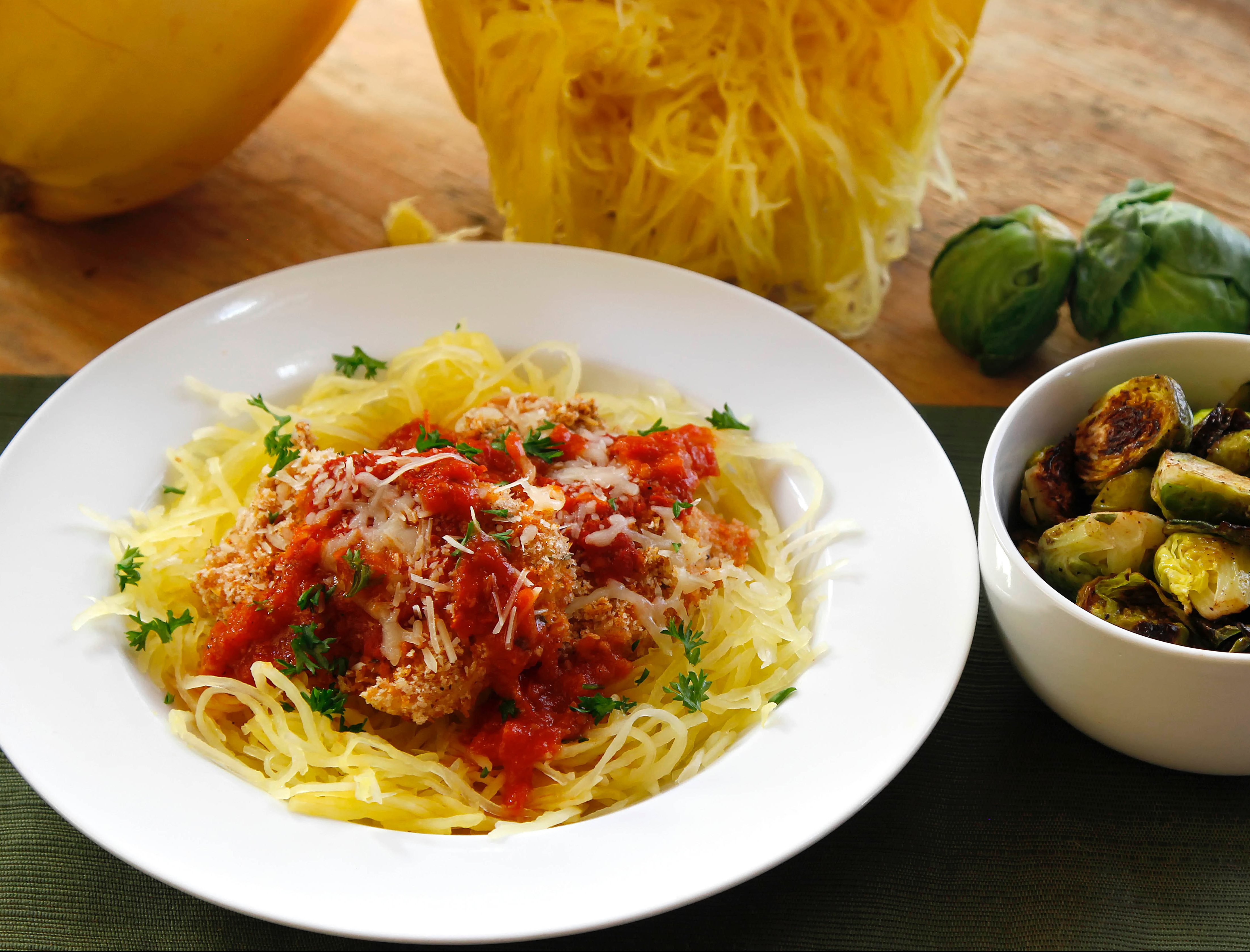 Baked Chicken Parmesan over Spaghetti Squash Noodles- Moroccan Spaghetti Squash