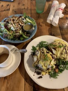 Another great meal we enjoyed was at a local restaurant in Marquette, MI with a movie theater theme called Delft Bistro where we split a fantastic salad with granny smith apples, dried cranberries, candied walnuts, blue cheese and a maple vinaigrette. We also shared a Wild Mushroom Eggs Benedict that had wild mushrooms, baby spinach, a poached egg, sage bearnaise and balsamic reduction on a toasted English muffin. WOW! It was incredibly delicious and loaded with flavor. (Stay tuned, we have plans to re-create this Mushroom Benedict for the website!)