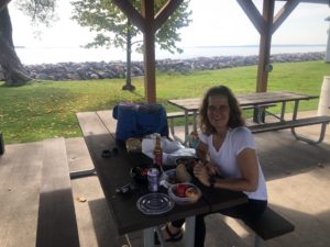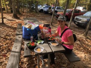 Our list of helpful foods and supplies to take: 2 plastic bowls with lids (to make big salads for each person), plastic silverware for each person, loaf of whole grain bread, natural peanut butter, homemade or store-bought granola, bag of mixed nuts and dried fruit (to use as a salad topping), garlic chili oil (we are in love with this one from Trader Joe’s), fruit (such as apples and oranges), and aged balsamic vinegar (to use as salad dressing). Having these items allowed us to buy greens on the road and throw together a salad and peanut butter sandwich at picnic areas so we could enjoy nature and being outside while having a quick and easy – and healthy – lunch.