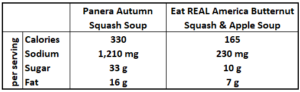 • Restaurant soups can be deceiving!  An Eat REAL America member told us she was obsessed with Panera’s Autumn Squash Soup.   She said she knew it probably wasn’t as healthy as it could be, but she loved it.  A few weeks later, we included our Butternut Squash and Apple Soup in a cooking demo for her company.  The verdict?  She said “WOW – this tastes even better than the Panera version!”, and she loved that it was so much healthier, especially being so much lower in sodium (230 mg vs. 1,210 mg in the Panera version).  Another example of the many benefits of making your own!