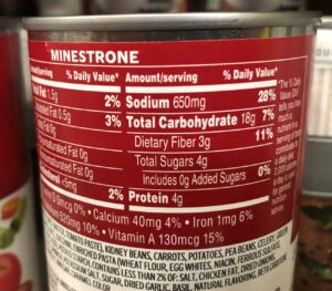 • Watch the sodium!  For preservation and to enhance flavor, canned soups can be VERY high in sodium, which is associated with high blood pressure, heart disease, stroke and kidney disease.  Even if we don’t have health concerns, it is still important to be conscious about sodium levels.  It is recommended we have no more than 2,300 mg of sodium per day (and less for those with high blood pressure).  It is shocking that 75% of the sodium we eat comes from processed foods or prepared foods, not the salt we add in cooking or at the table!  So, when choosing canned soups, it’s best to look for one that has less than 400 mg of sodium.  Here is the challenge…lots of canned soups have MUCH, MUCH MORE.  For example, a can of Campbell’s Condensed Vegetable Minestrone has 650 mg of sodium per 1/2 cup serving.  But wait!  There are 2.5 servings in one can.  Honestly, who is satisfied by eating only part of the can for one meal?  That means the whole can has 1,625 mg of sodium – almost an entire day’s worth!  As a comparison, our Very Veggie Minestrone on Eat REAL America has 365 mg per serving.