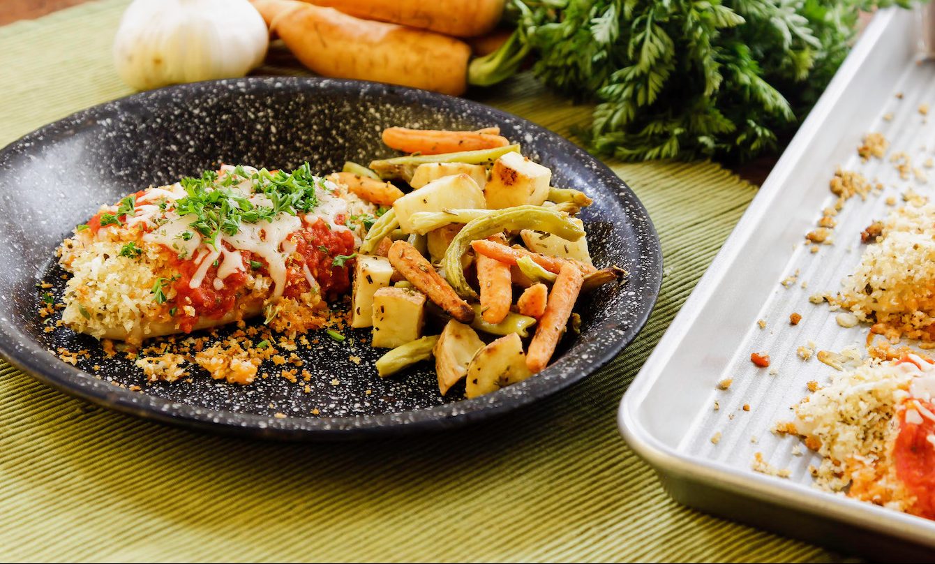 Mediterranean Roasted Eggplant Pasta with Lemon Garlic Fish