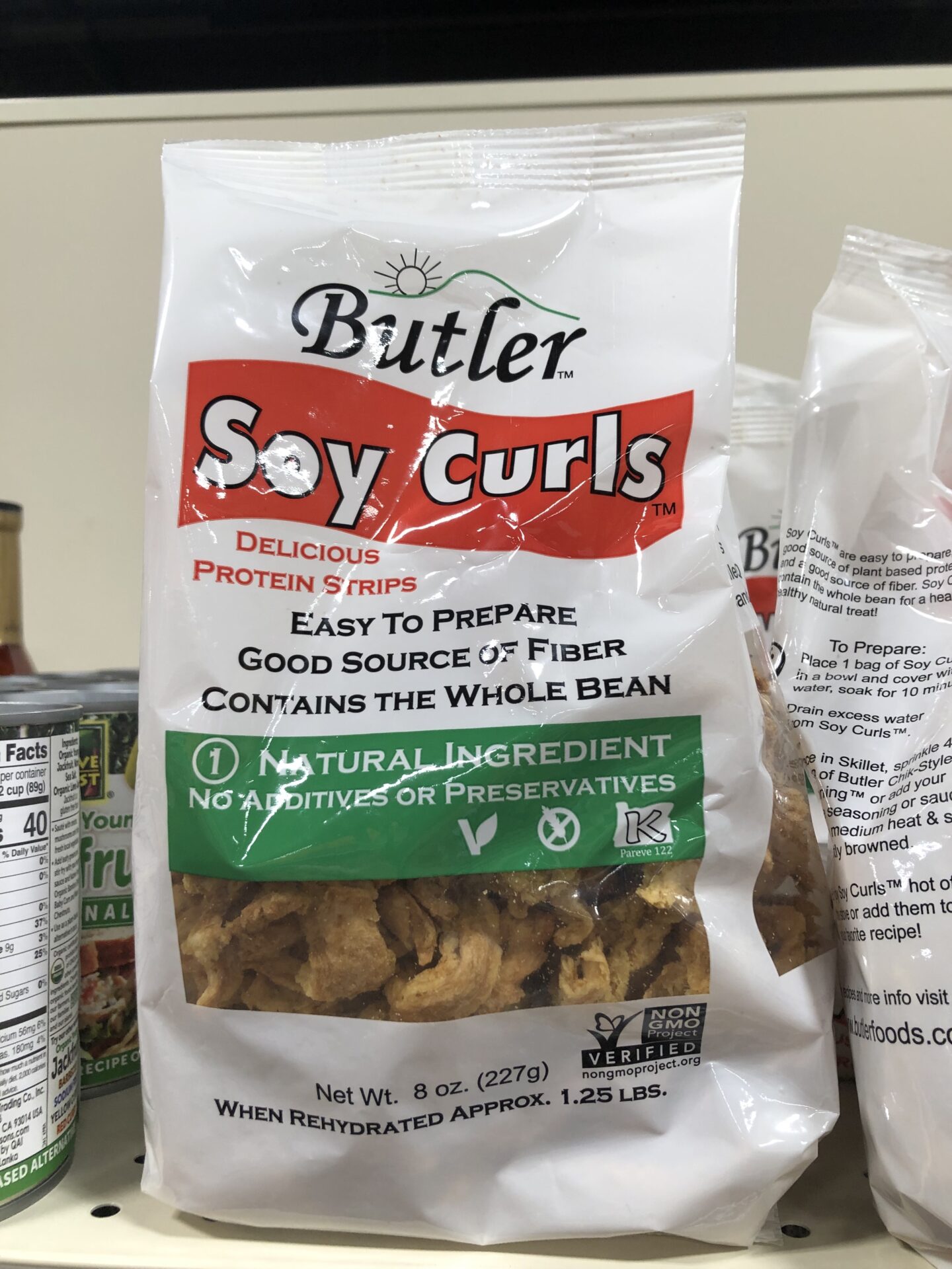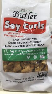 Soy curls are made by slowly cooking whole soybeans, and then stretching them into their unique shape. They are then dried, packaged and shipped. The most readily available variety is made by Butler Foods and can be ordered on Amazon, or you can pick it up in some grocery stores (Natural Grocer carries them in our area). One serving (3/4 cup dried) has 6 grams of fiber and 11 grams protein.