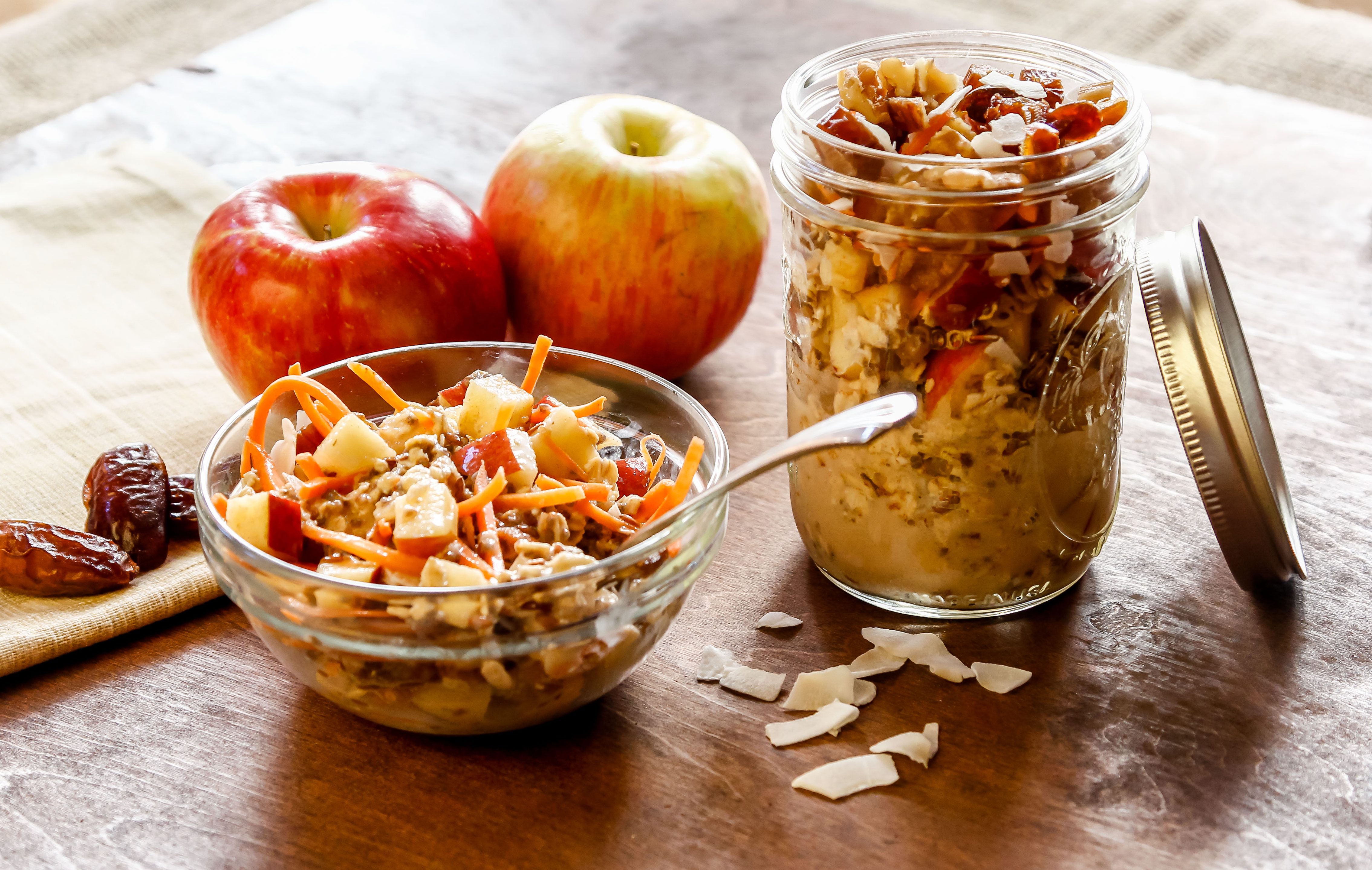 - Carrots, coconut, walnuts and dates in the Carrot Cake Overnight Oats