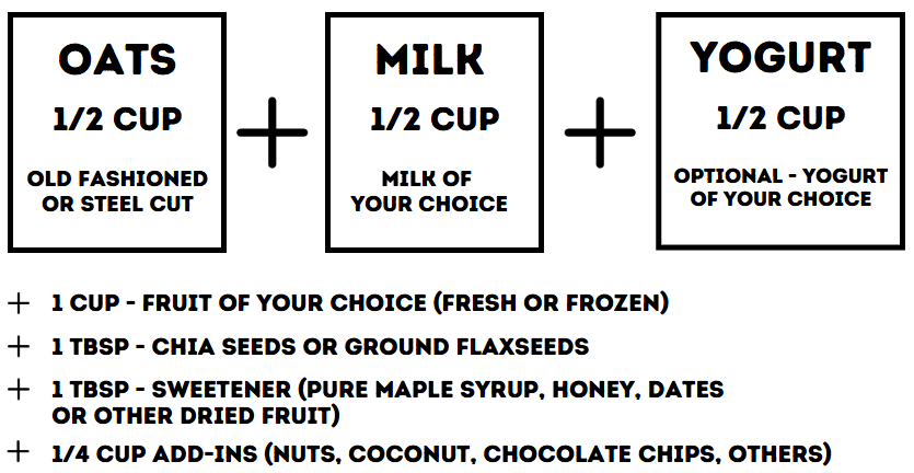There is a basic formula for 2 servings you can use if you are new to overnight oats. Plus, this makes it easy to whip up a batch without feeling like you have to “follow a recipe.” Feel free to adjust this formula based on your preferences as you find the consistency you like best.