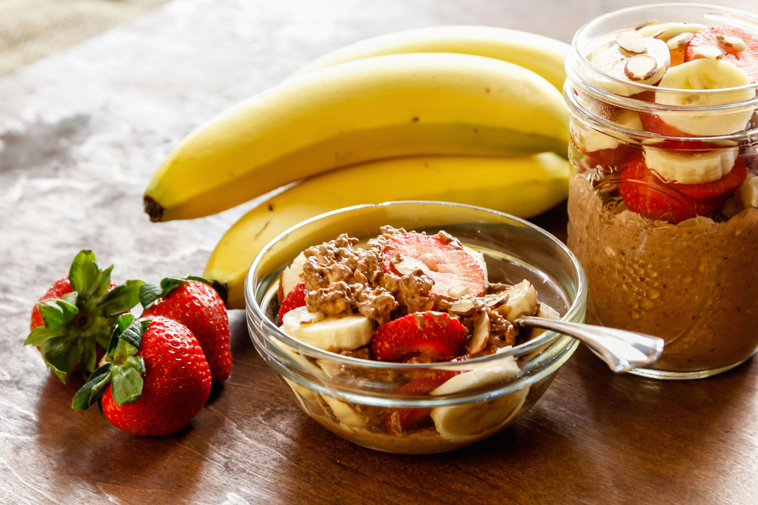 - Peanut butter, cacao, banana, almonds and dark chocolate chips in the Chocolate Peanut Butter Overnight Oats