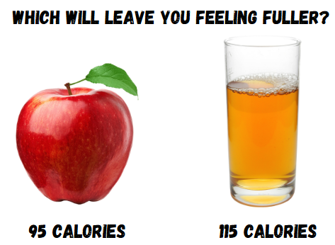 Fills you up. REAL FOODS are naturally high in fiber, which slows digestion, keeps blood sugar levels steady, and promotes a feeling of fullness. This is why eating an apple leaves you feeling fuller for longer than drinking a glass of apple juice, even if both contain a similar number of calories. The fiber is working to slow the absorption of sugar and help you feel satiated. In our coaching tip about the Fed Up documentary, Dr. Mark Hyman says, “When you eat food with a lot of nutrients and fiber…it’s going to make you full before it will make you fat.”