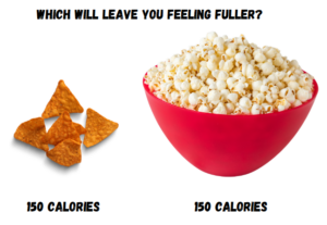 Volume matters. Because REAL FOODS have a higher water and fiber content, they are naturally lower in calories while taking up more space in your stomach. Think about how you would feel after eating those 16 cups of spinach vs. the 3 Oreos. You probably wouldn’t even be able to finish the 16 cups of dark leafy greens. The Oreos, on the other hand, would probably find you seeking out another snack soon after. Take another example…a small bag of Doritos has 150 calories, the same amount as about five cups of air-popped popcorn. The popcorn provides more volume, helping you feel full and less likely to grab another snack later.