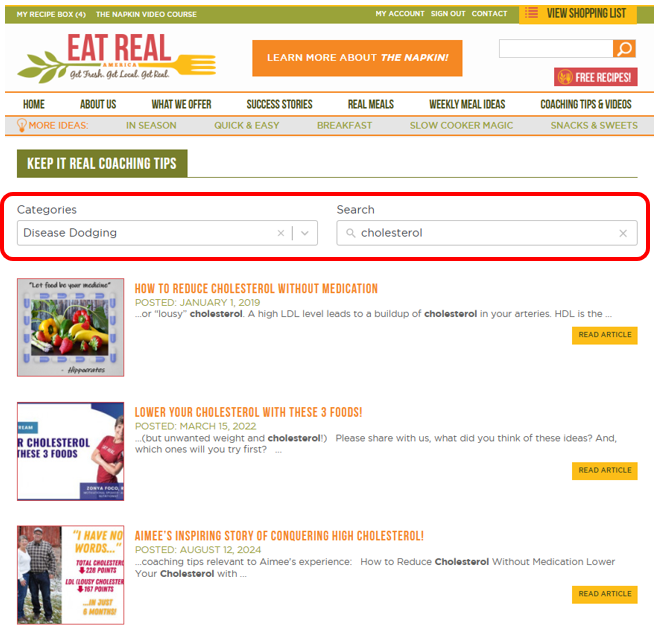 For example, you can select Coaching Tips and search “cholesterol.” Or select Videos, and then search the category Grocery Store Tours and search “yogurt.”