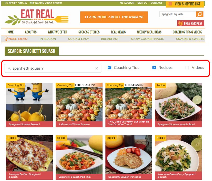 For example, if you type “spaghetti squash” in the search bar, it will first show you all the recipes on the site. Then, you can also select the checkboxes for coaching tips and/or videos to also include those in your search.