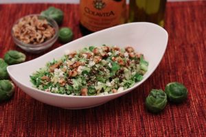 Balsamic vinegar:  made from fermented whole processed grapes.  Check the ingredient label, as some balsamic vinegars include caramel coloring and/or sweetener.  If the label includes “grape must,” which is the juice from the crushed grapes, that is a good thing, especially if it is the first or only ingredient.  (Keep in mind, it tends to contribute a slight amount of additional natural sugar and calories.) When it comes to balsamic vinegar, a longer-aged balsamic will provide a richer and smoother flavor.  But it also comes with a higher price tag.  So, save the pricier version to send the flavor over the top for salad dressings or to include as a drizzle to “finish” a dish – like the Balsamic Shredded Brussels Sprouts.  Then, you can use the more moderately priced balsamic vinegars in your cooking and your everyday salad dressings.