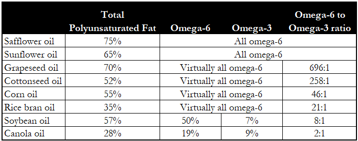 As you can probably guess, a big reason for this imbalance is the prevalence of highly processed foods and fast foods, many of which contain inexpensive and readily available seed oils with high amounts of omega-6 and little or no omega-3 fats. Here is the polyunsaturated fat profile for some of these seed oils: