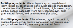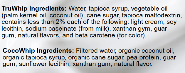 TruWhip is marketed as a more natural alternative. It is light and fluffy and we thought it had a marshmallow-like taste and texture. While it is a slightly cleaner option (especially if you are trying to avoid hydrogenated oils, high fructose corn syrup, or other ingredients you wouldn’t keep in your pantry), it is still a highly-processed dessert topping.