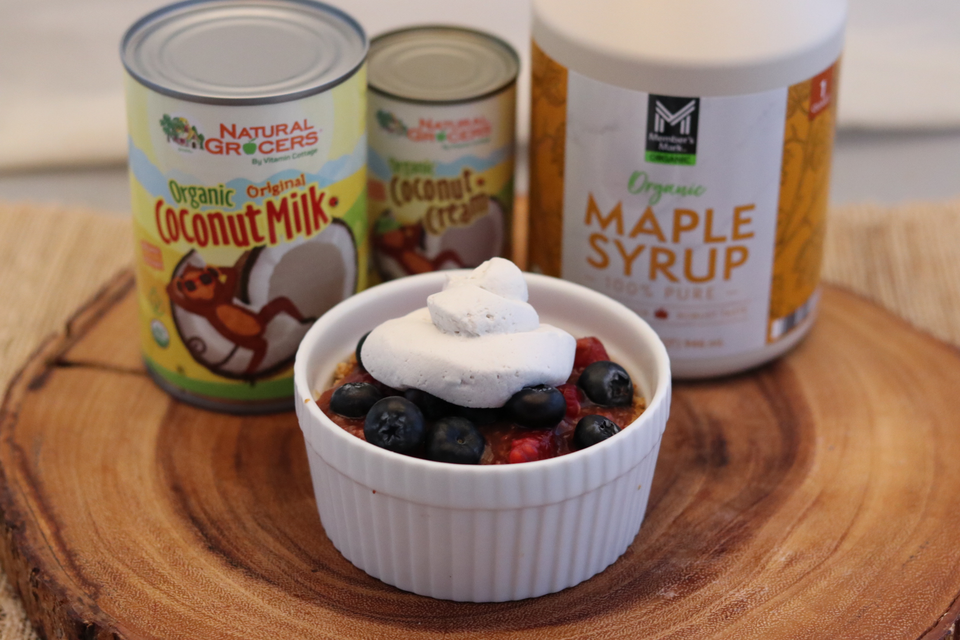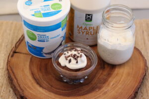 Ingredients: 1 (13.5 oz) can full-fat (not lite) coconut milk, 1 Tbsp pure maple syrup, 1/2 tsp vanilla. Note: you could use a 5.4 oz can of coconut cream as a substitute for the can of coconut milk.