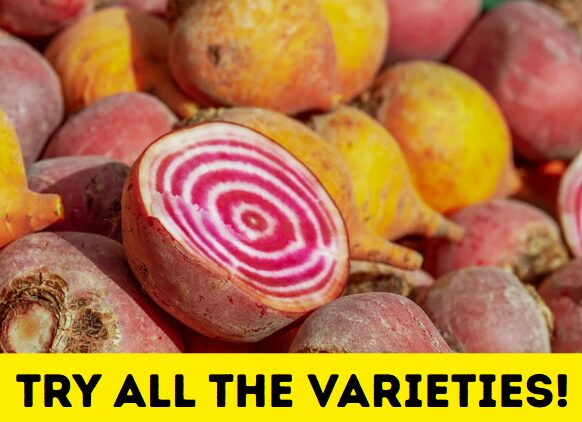 • Chioggia beets – naturally striped similar to a candy cane, these tend to be the sweetest variety.  Keep in mind, the striped pattern will fade or disappear when the beets are cooked.
