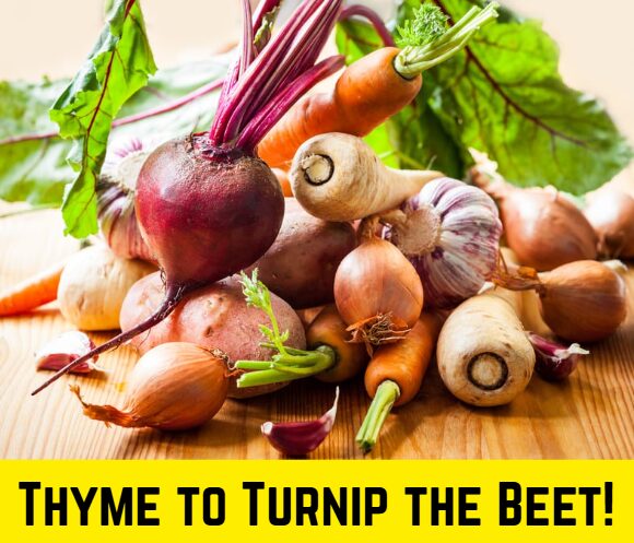 Picture of a variety of root vegetables with the caption "Thyme to Turnip the Beet!"