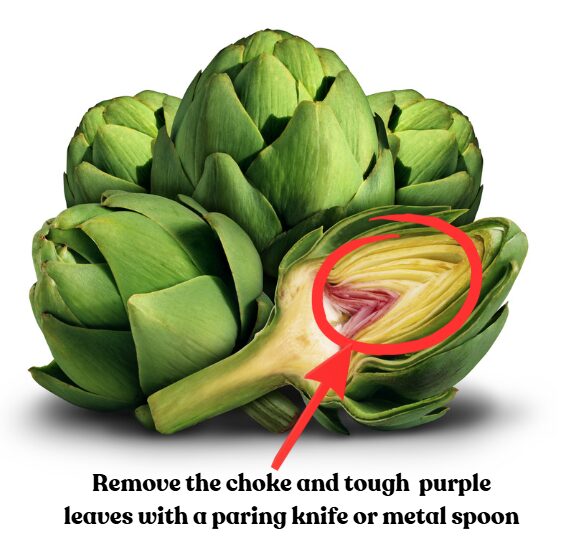 - Cut in half lengthwise and scoop out the choke (the fuzzy part and tough purple leaves in the center). A paring knife and metal spoon work great for this.